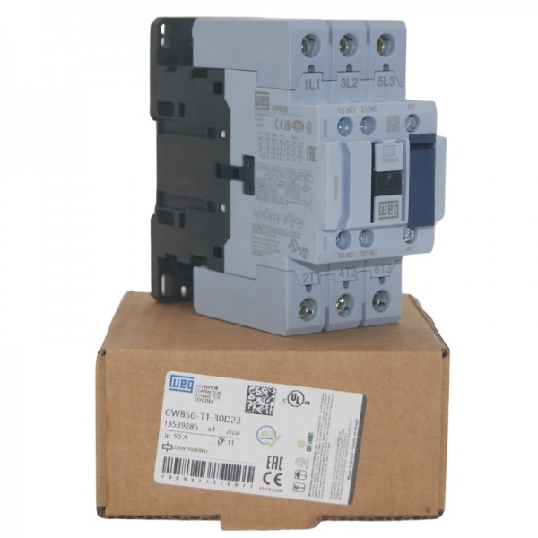 Os Contatores, em geral, são dispositivos eletromecânicos que fazem o controle on/off de cargas elétricas a partir de um circuito de comando. Sendo assim, a linha de Contatores Weg CWB, foi produzida através de resultados obtidos pela análise de softwares de modelagem para simulação de sistemas eletromagnéticos e eletromecânicos, desse modo, os contatos elétricos dos contatores CWB são fabricados com ligas especiais de prata, que asseguram excelente condutividade elétrica e alta confiabilidade de contato. Durante a operação, os contatos de abertura dupla e as câmaras de extinção garantem a rápida extinção do arco e uma elevada resistência contra os efeitos de desgaste do arco elétrico, e consequentemente, uma longa vida elétrica. Cod:013235