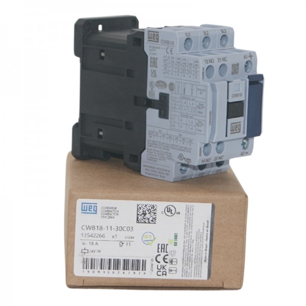 Os Contatores, em geral, são dispositivos eletromecânicos que fazem o controle on/off de cargas elétricas a partir de um circuito de comando. Sendo assim, a linha de Contatores Weg CWB, foi produzida através de resultados obtidos pela análise de softwares de modelagem para simulação de sistemas eletromagnéticos e eletromecânicos, desse modo, os contatos elétricos dos contatores CWB são fabricados com ligas especiais de prata, que asseguram excelente condutividade elétrica e alta confiabilidade de contato. Durante a operação, os contatos de abertura dupla e as câmaras de extinção garantem a rápida extinção do arco e uma elevada resistência contra os efeitos de desgaste do arco elétrico, e consequentemente, uma longa vida elétrica. Cod:014219